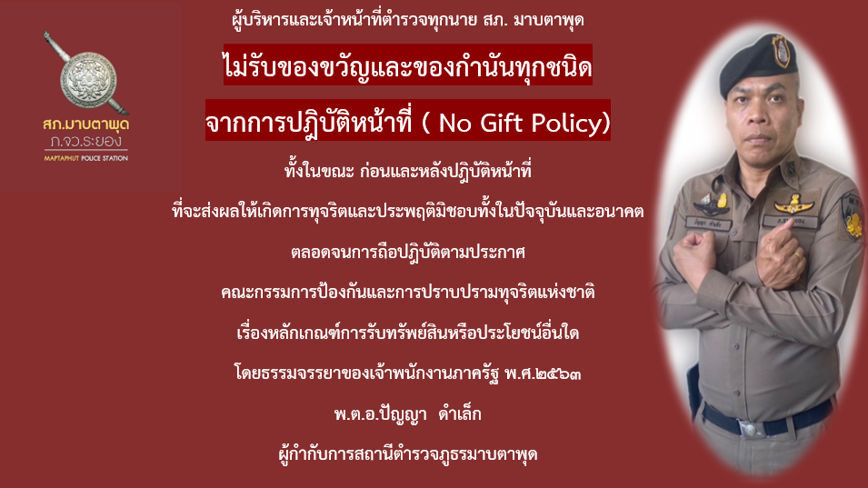 ติดไว้ในจุด บริการของสถานี เพื่อให้ประชาชนทราบว่า หน่วยงานประกาศว่าเจ้าหน้าที่ทุกคนในสังกัดไม่รับของขวัญหรือของกำนัลจากการปฏิบัติหน้าที่ และต่อต้านการรับสินบน โดย มี พ.ต.อ.ปัญญา ดำเล็ก ผกก.สภ.มาบตาพุด หัวหน้าหน่วยงานประกาศ