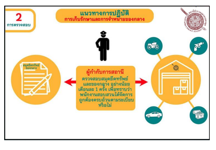 - ตรวจสอบและตรวจนับอาวุธยุทธภัณฑ์ของสถานีตำรวจเพือ่ให้มีความพร้อมต่อการใช่งานในภารกิจประจำวัน